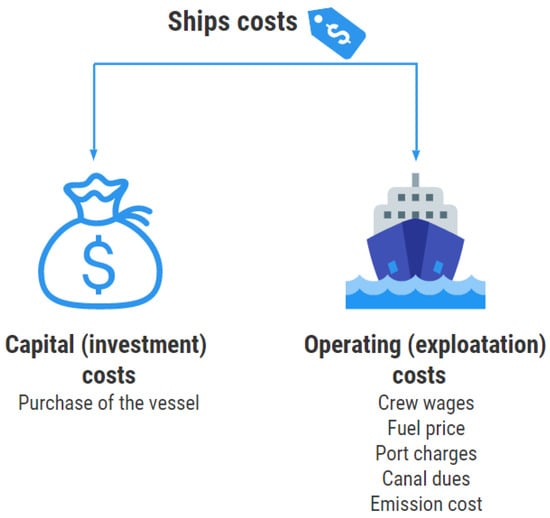 - Operating (exploitation) costs involved in the day-to-day running of the ship, such as crew, administration, stores, insurance and maintenance costs. In addition, expenses related to specific route, such as fuel cost, port charges, canal dues and emission cost, are included.