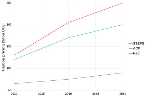The Paris Agreement, adopted by 195 nations in December 2015, aims to cut emissions in 2050 to half of 2005’s levels [66]. Currently, in the shipping sector, there are no direct emission taxes; however, there is a set of regulations prescribing a gradual decrease in ship emissions. The carbon credit should be seriously considered for future ship designs [67]. Carbon credit costs are calculated by interpolating the forecast values of the carbon allowance (CA) [67], and are shown in Figure 4. Each CA refers to a permit to emit 1 ton of CO2 emission [68]. The considered scenarios are as follows [67]:
