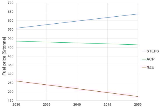 where α is daily fuel consumption, EF is CO2 emission factor and CAi is carbon pricing for a year i. EF for heavy fuel oil is 3114 (g/kg of fuel) [69]. Fuel prices are also taken for different scenarios and illustrated in Figure 5.