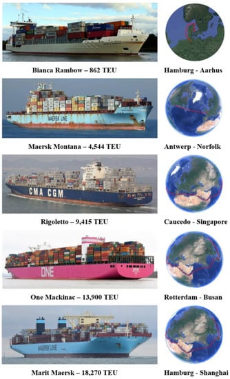 Costs are calculated for the conventional vessel, and appropriate changes in costs are used for calculations for the autonomous vessel. In Figure 6, the selected vessels and shipping routes are presented. Vessel technical data and routes are obtained from [70] and presented in Table 1.