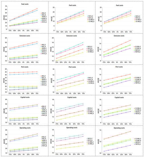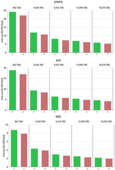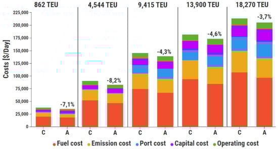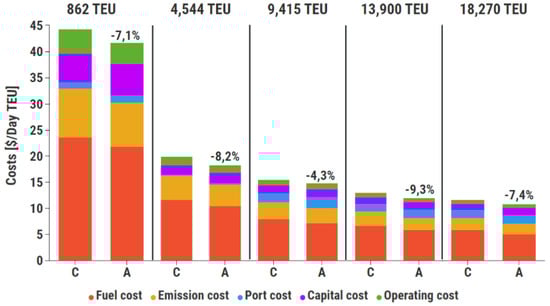 For autonomous vessels, data collected through the project MUNIN and published in [62] is used to calculate the costs of unmanned autonomous vessels. Within operating costs, crew wages and crew-related costs are deducted. By taking into consideration new equipment and rent, wages for personnel in the shore control centre (SCC) are added, which correspond to 133,400 $ per year. It is estimated that fuel consumption for autonomous ships is reduced by 10%, taking into consideration reduced air resistance, lower lightship weight and lack of hotel system [62,74]. Port calls are approximately 20% higher for autonomous vessels [62]. The overall production cost of the autonomous vessel is defined as 10% higher than of the conventional vessel price [62]. For 13,900 and 18,270 TEU container vessels, which are twin-island, as there is no crew onboard, minimum visibility from the bridge is not mandatory. This increases their capacity, 13,900 TEU by 5.2%, and 182,700 TEU by 3.9% [75]. Fuel consumption is used for calculating CO2 emissions which are converted to daily emission costs per container for three scenarios in Figure 7. Figure 8 illustrates the daily fuel cost per TEU for three scenarios. In further text abbreviation, C stands for conventional while A for the autonomous vessel.
