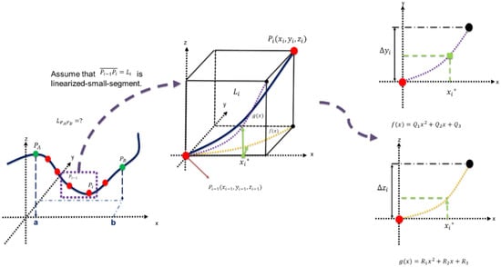 By using the decomposed quadratic interpolation functions for y and z locations (f(x), g(x)) in the x-y and x-z planes (Figure 2) and mean value theorem (Equation (3)), the small segment length equation (Equation (2)) can be re-written as (Equation (4)):