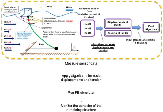 In this section, the overview of the DA approach (tracing algorithm and FE simulator) for riser structure health monitoring with minimum sensors is presented, as shown in Figure 5. The new approach is called the DA hybrid method since both the displacement tracing algorithm based on sensor signals and the FE simulator are simultaneously used. First, it is assumed that the sensor signals attached along the top part of a riser can be acquired in real-time. Since sensors (bi-axial inclinometers) are located only at the top part of riser (close to the free surface relatively), electric/optical wire can directly be connected between the floater and sensor so that it can provide power and data transmission and will be free from battery replacement. Next, the measured angle-sensor data can be used to trace node displacements and tension up to the target point (same location as the last sensor attached) by using an algorithm. Furthermore, with the assumption that wave actions are sufficiently reduced at the sufficiently submerged riser target point, the FE simulator can be applied with the given target node displacements and tension without any wave effects. For example, in deep water, 200 m submergence depth of the target point is enough to neglect all wave effects of wavelength up to 400 m (wave period = 16 s). However, depending on specific site conditions, there may be nontrivial current below that point, which can be inversely estimated in real time by using the implemented angle sensors and relevant ML approach. The details are given in Ref. [34]. In this paper, it is assumed that the current velocity below the target point is given by applying a typical power law (Equation (17)). Then, finally, an FE riser simulator can be employed and run by inputting the estimated target-point movement and tension in the presence of current if any. In summary, (i) the riser top point can be traced by GPS (Global Positioning System), (ii) riser top tension can be measured by a tension meter there, (iii) the signals of a couple of angle sensors can be received in real time, (iv) then the riser-profile-tracing algorithm is applied to get the movement and tension of target point, (v) FE simulator is run with the given target-point inputs (movement and tension) to reproduce the dynamic behavior of the entire riser below that target point, (vi) then, all motions and stresses of the entire riser can be obtained, and the real-time accumulated fatigue damage can also be assessed. In the above DA method, the basic condition is that the FE riser simulator can reliably reproduce the actual physical riser behavior for any given top forced oscillations.