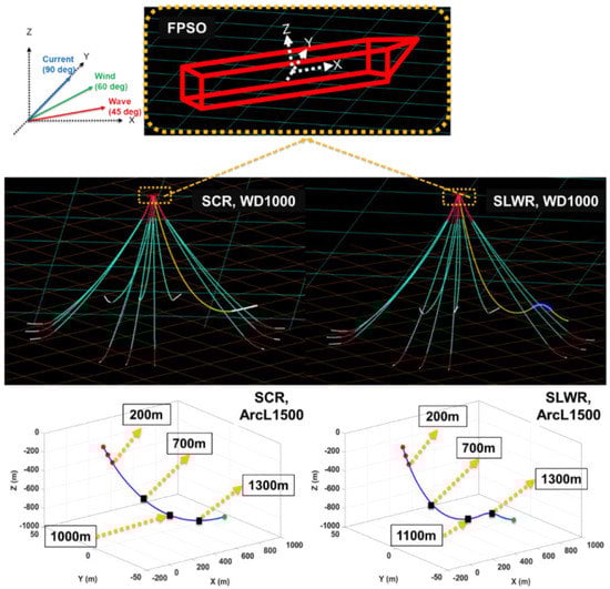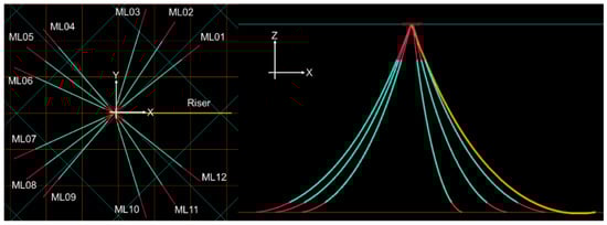 As a floater in this study, the default spread-moored FPSO given by OrcaFlex was selected with the corresponding added mass, radiation damping, and first- and second-order wave loads accordingly [16]. A total of 12 mooring lines (with four groups) are employed for the station-keeping in 1000 m water depth. Each mooring line consists of a chain–polyester rope–chain combination. Additionally, as shown in Figure 6, it is assumed that only three inclinometers are attached along the top part of riser at 100 m intervals (entire riser arc length = 1500 m). Detailed mooring system and riser material properties are summarized in Table 2.