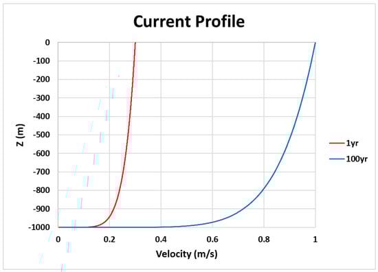 In the above section, the riser tracing algorithm using angle sensors was explained. As a FE simulator for line dynamics, we used a commercial program OrcaFlex. In this section, numerical results for two different approaches, the proposed DA method and the simpler FTO method, will be presented, and they will be compared with the actual values. The predicted node displacements, tensions, and bending moments at various riser locations will be compared with the corresponding actual values. As for environmental conditions, 1-yr and 100-yr storms with noncollinear wind-wave-current are considered as summarized in Table 4. The wave, current, and wind headings are 45 deg, 90 deg, and 60 deg, respectively. This noncollinear environment is intentionally employed to trigger 3D riser dynamics. According to Equation (17), the current profile was inputted with given surface velocity (Figure 8). As an example floating system, OrcaFlex default FPSO with mooring (SPM) system is selected [32]. The FPSO dimension and specifications are tabulated in Table 5. Additionally, the mooring and riser coordinates and their arrangement are presented in Table 6 and Figure 9. The FPSO motions under 1-year and 100-year storms are plotted in Figure 10. The corresponding results for both SCR and SLWR are presented in the following.