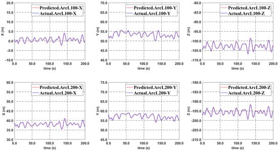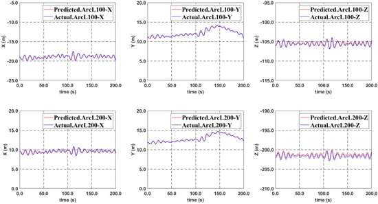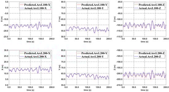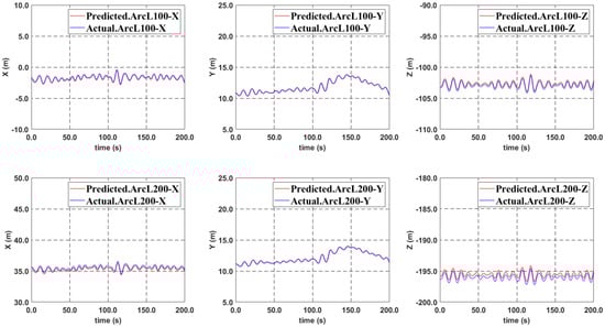 First, the developed DA approach was applied to the SCR of FPSO. As previously explained, by using the quadratic interpolation function and curve length equation in 3D space, the node displacements can be traced progressively using the angle sensor information and top point measurement. Additionally, the tension can also be traced, as described in the previous section. Figure 11 and Figure 12 show that the suggested algorithm can actually trace the node displacements and tensions very well up to the target location at 200 m arclength (≈submergence depth) when the predicted values are compared with the actual values. The results are given for both 1-yr and 100-yr noncollinear storms to make sure that the schemes work for any sea conditions. Then, the FE riser-dynamics simulator was applied with the obtained movement and tension at the target point. Below the target point of 200 m submergence depth, the wave action is sufficiently attenuated, so wave inputs need not be included in the FE simulator. Instead, the wave effects are indirectly reflected through sensor signals and the tracing algorithm. Similarly, the effect of current above the target point is already indirectly included through the tracing algorithm. On the other hand, when the current penetrates deeper than 200 m, current below the target point needs to be included in the FE simulator. Then, the displacements, tensions, and bending moments can be obtained for any locations below the last sensor position (= target point) through the FE-simulator outputs in near real-time. The associated time lag is within a couple of seconds since the run time of the tracing algorithm and the FE simulator is an order of one second with a typical PC. The corresponding accuracies for tracing riser motions below the target point are presented additionally in Appendix A. The results show that the entire riser profile can be very well traced by using the present DA approach.