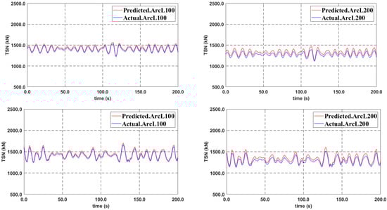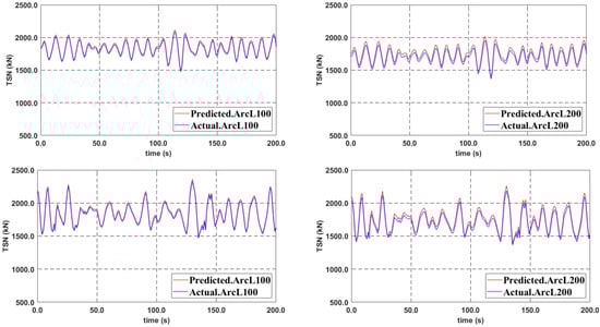Next, as before, the FE simulator was run for the SLWR with the estimated movements and tensions at the target point. The corresponding tension and bending-moment results below the target point are presented in Figure 16. Since the lazy wave zone (= arc length 1200–1350 m) is the most critical region for SLWR system, three different locations (1100 m, 1250 m, and 1450 m) near the lazy wave zone and one additional middle part (700 m) are selected and compared. The corresponding comparisons of displacement snapshots are given in Appendix A, which shows that by using the proposed DA-based hybrid method, the predicted values agree well with the actual values. In the case of SLWR, the free-hanging portion of the riser is much longer than that of SCR, and thus the riser movements are more influenced by the wave and current. Therefore, the errors associated with the simpler approach FTO are generally larger than those in the SCR case, especially in the 100-yr storm (see Appendix B). The corresponding statistical characteristics and associated errors of the DA-based and FTO-based approaches are tabulated in Appendix B. The errors of the FTO method in bending moment on the upper portion of the SLWR are particularly pronounced in the 100-yr storm since the wave action is not considered in the upper portion.