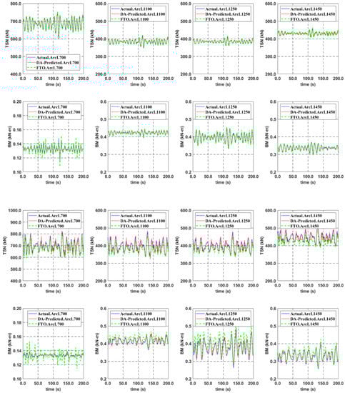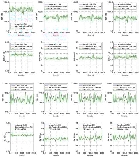 In the case of SCR, the dynamics near TDP (touch down point) is the most critical including the possibility of local dynamic buckling under the 100-yr storm [35,36]. Therefore, the tensions and bending moments at three locations (1200 m, 1250 m, and 1300 m) near the TDP are presented. One additional mid-length location (700 m) is also selected. In Figure 13, the comparisons of the time histories of tension and bending moment at four locations are shown. The predicted values by the suggested DA and simpler FTO approaches are compared with the actual values. Good agreements between the actual and DA-predicted values can be observed for both 1-yr and 100-yr storms. This means that the developed tracing algorithm and the subsequent FE simulator can capture the actual dynamic behaviors of the riser in near real-time. The figure also shows that even the simpler FTO approach roughly follows the actual values while the corresponding overall accuracy is diminished compared to the DA approach (see Appendix B). The errors of the FTO approach in the 100-yr storm are larger than those in the 1-yr storm since wave actions on the upper portion of the riser were neglected, i.e., the neglected wave effects of the former are expected to be larger than those of the latter. It should also be reminded that the current effect is not included in the FTO approach. The corresponding statistical characteristics, typical errors, and their comparisons are tabulated in Appendix B. From these results, it can be concluded that the present DA approach is reliable and accurate in tracing displacements, tensions, and bending moments along the entire length of the riser. The simpler FTO approach has larger errors but is still practically useful when high accuracy is not an important concern. The FTO’s error is particularly increased over the upper portion of the riser since direct wave action on riser is not included there.