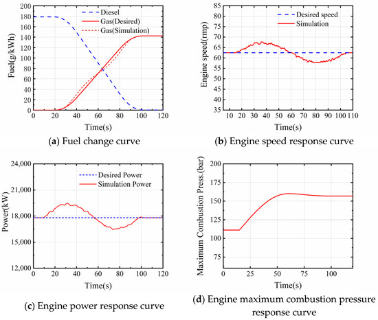 To ensure the smooth operation of the engine under the transient conditions of fuel-mode switching, the simulation model needs to meet the corresponding requirements determined by the engine manufacturer, and the switch from gas to diesel mode needs to be completed within 2 s under fixed load conditions; the switch from diesel to gas mode needs to be completed within 2 min. The engine speed fluctuation during fuel-mode switching should be less than 10% of the rated speed.