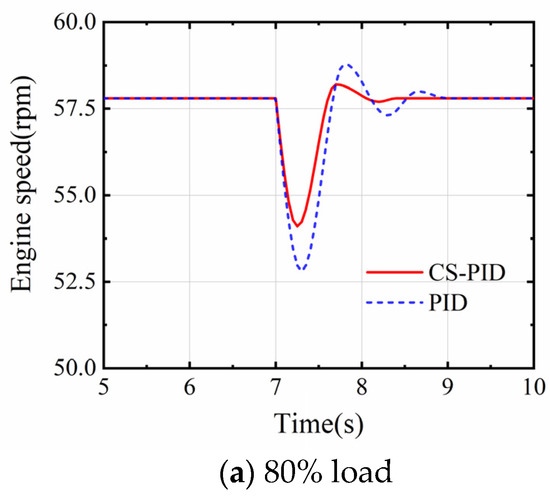 As shown in the simulation results in Figure 9, the changeover from diesel to gas mode is completed within 2 min after the start of the fuel-mode switching operation, and the speed fluctuation is less than 10%. This meets the manufacturer’s requirement that the changeover from diesel to gas mode operation be completed within 2 min and that the speed error is less than 10% of the rated speed.