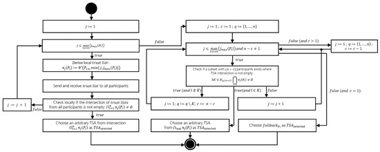 It is assumed that each participant has an internal prioritization of TSAs and wants to maximize the trust by choosing the TSA ranked highest in its local priority list. To ensure that the TSAs with the highest trust from all of the participants are found, the potential TSAs are exchanged in several iterations such as (a higher number of iterations, means less trust as the lists of possible TSAs are extended with lower prioritized TSAs by each participant). We call a set of TSAs that is trusted by a participant the trust list of . Theoretically, any participant can arbitrarily choose trust lists in every iteration. However, we propose the following method for determining the trust list of a participant in iteration of the protocol: