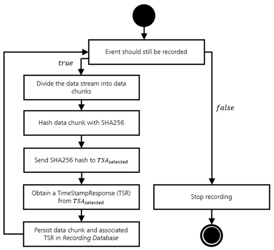 - Record the data: The Data Recorder is responsible for recording and signing the data that should be documented. Therefore, the Data Recorder periodically divides the data stream from a participant into discrete chunks and sends the hashed chunks to the TSA derived by the TSA Negotiator. Afterwards, the TSA’s original data and signature are stored locally in the Recording Database.