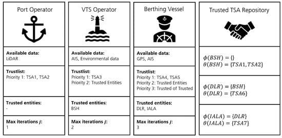 - Iteration : In the second iteration, participants are requested to expand their list of trusted TSAs. Therefore, the VTS Operator and the Berthing Vessel include the TSAs of their trusted entities. The VTS Operator trusts the BSH. Based on private relationships or the use of the Public Trusted Entities Repository, the VTS Operator knows which TSAs are trusted by the BSH. In this case, the BSH trusts TSA1 and TSA2, so they are included into the VTS Operator’s TSA list. The Berthing Vessel relies on the DLR and the IALA. The DLR trusts TSA6 and the IALA trusts TSA7. Therefore, both TSAs are also included in the list of the Berthing Vessel. The Port Operator follows a very strict strategy and trusts only his own two TSAs. There is no extension of the list at all. Afterwards, every participant broadcasted their trust list and it is checked again whether a common intersection exists between the participants. After iteration , the intersection at TSA is still empty, so the next iteration is initiated.