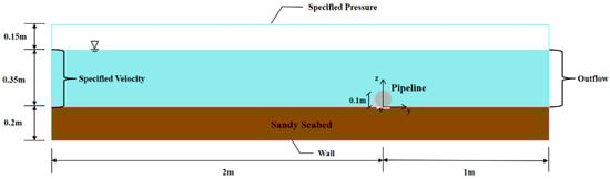 The 2D computational domain established in the y-z coordinate system is shown in Figure 1. The water flume is 3.0 m in length and 0.7 m in height with a 0.2 m thick sand bed. The still water depth is 0.35 m. A submarine pipeline with a diameter of D = 0.1 m is laid on the sandy seabed without a gap, i.e., the initial embedment depth e = 0. The numerical model setup is shown in Figure 1. The direction of water flow is in the positive y-direction. The length of the sand bed upstream of the pipeline is 20 D, which can guarantee a fully developed current profile at the pipeline. An initial scour hole of 0.1 D is set below the pipeline to simulate the onset of scour. Previous studies have shown that the initial scour hole will have little effect on the scour process and the final scour depth [].
