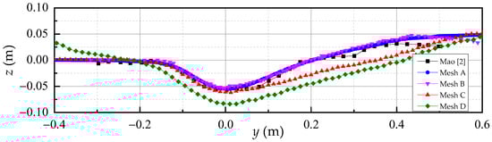 A mesh sensitivity analysis was carried out using four meshes, i.e., Mesh A, B, C and D, as listed in Table 2. The numerical results of the 2D scour hole profile below the pipeline at the final stage of t = 370 min are compared with the experimental result of Mao [], as shown in Figure 2. The convergence of the simulation results is achieved at Mesh A and Mesh B. However, the total number of Mesh A is over three times that of Mech B. For Mesh B, the total cell number is 28,800, with a uniform grid size of 0.01 m in the y-direction and a minimum size of 0.002 m and a maximum size of 0.01 m in the z-direction. The minimum time step is set to 10−3 s. Considering both efficiency and accuracy, the mesh density level of Mesh B is adopted in the following studies.