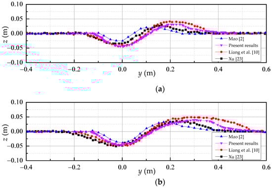 In this section, the 3D scour propagation along the spanwise direction of a pipeline is simulated to further validate the numerical model. The flume width is 1.0 m. A pipeline with a diameter of 0.1 m is laid on the seabed with a zero-embedment depth. The related 3D scour model parameters are listed in Table 3. The current is perpendicular to the pipeline. To initialize the scour, an initial scour hole of 0.1 D was set below the center point of the pipeline, as implemented by Cheng et al. []. Then the 3D scour propagates along the span from the middle to the ends of the pipeline. Then, the numerical results are compared with those of Xu [] and the empirical values of Cheng et al. [].