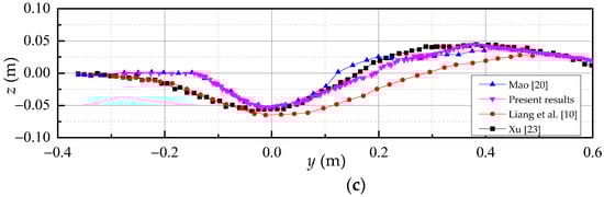 Comparison of scour hole profiles below the pipeline: (a) t = 10 min; (b) t = 30 min; (c) t = 200 min.