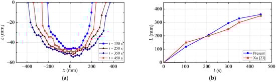 Figure 4a shows the vertical profiles along the pipeline axis at four-time instances. The spanwise scour hole is basically symmetrical about the middle point when the pipeline is perpendicular to the current. Figure 4b shows the development of the free span length with time. The numerical result of Xu [] is also plotted for comparison. The free span length increases almost linearly with time. It is observed that the present numerical result agrees well with that of Xu []. Then the propagation rate of the 3D scour along the pipeline (Vh) is calculated through the curves and is presented in Table 3. The present numerical result of Vh agrees well with those published by Xu [] and Cheng et al. [], as shown in Table 3.
