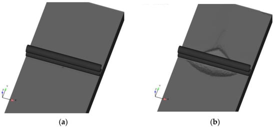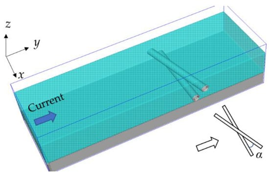 A 3D numerical model for scour below two crossing pipelines is shown in Figure 5. The side view of the computation domain in the y-z plane is the same as that shown in Figure 3. As the development of scour depth below the crossing point of the pipelines is mainly focused rather than the 3D scour propagation, short segments of the pipeline are simulated in the present study. The flume has a width of 1.0 m, i.e., x = −0.5 m~0.5 m. The lower pipeline is fixed and perpendicular to the flow direction, laying directly on the seabed with a zero-embedment depth. The upper pipeline is placed above the lower one at their middle points with an intersecting angle α. Here, α = 0° denotes that the two pipelines are parallel, and α = 90° denotes that the upper pipeline is placed along the flow direction and perpendicular to the lower one. The gap between two pipelines at the crossing point is set as zero. All flow and sediment parameters are the same as those listed in Table 3. Numerical simulations of scour process below the two pipelines are carried out at five intersecting angles, i.e., α = 0°, 15°, 30°, 45° and 90°.