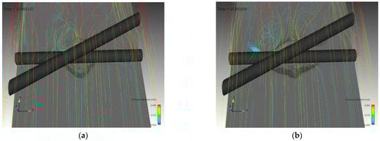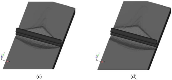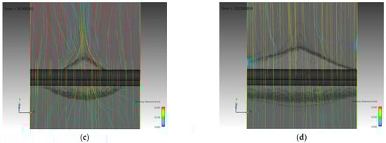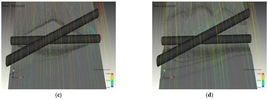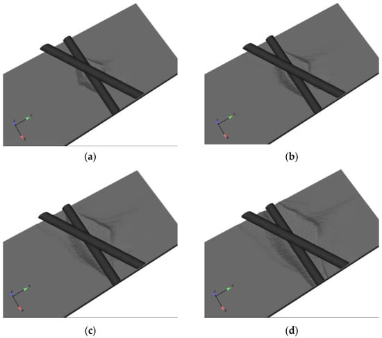 Streamlines around the pipelines for α = 30°: (a) t = 10 s; (b) t = 50 s; (c) t = 200 s; (d) t = 900 s.