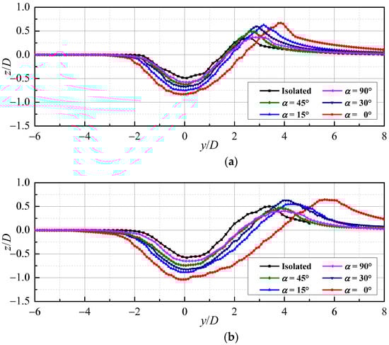 Figure 8 compares the scour hole profiles at the cross section of the middle width of the flume (i.e., x = 0 m) for different intersecting angles at t = 300 s and 900 s. The scour hole profile for an isolated pipeline is also plotted for comparison. It can be found that due to the existence of the upper pipeline, the maximum scour depth and the width of scour hole below the lower pipeline are larger than those of an isolated pipeline, and the maximum scour depth and width of the scour hole decrease with the increase of the intersecting angle.