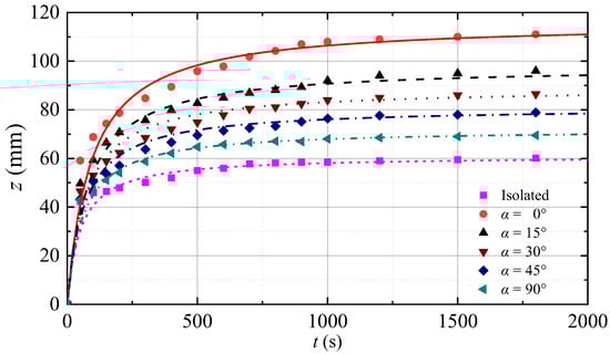 In the present study, the scour depth below the center point of the pipeline, i.e., the crossing position, is specifically investigated. Figure 9 shows the temporal development of the scour depth below the pipelines for α = 0, 15°, 30°, 45°, 90° and an isolated pipeline, respectively. The scour depth develops rapidly at the initial stage, then increases gently with time, finally reaching a final equilibrium state. The isolated pipeline has the minimum scour equilibrium depth in all cases, indicating that the crossing of the upper pipeline can enhance the equilibrium scour depth. The scour equilibrium depth S has the largest value for α = 0° and decreases with the increase of the intersecting angle. The scour equilibrium depth has the minimum value for α = 90°, which is still greater than that of an isolated pipeline.
