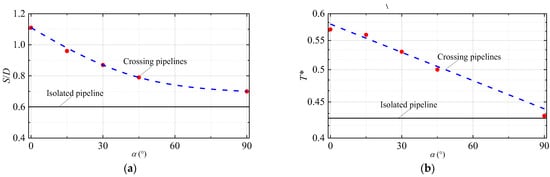Variations of (a) S/D and (b) T* with intersecting angle α.