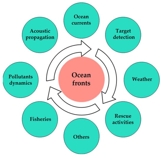 The ocean front is a narrow zone of enhanced horizontal gradients of seawater properties (temperature, salinity, sound speed, nutrients, and so on) that separates broader areas with different water masses or different vertical structures (stratification) [14]. The ocean front plays an important role in the world’s oceanic and atmospheric environment (Figure 1). Ocean fronts are often described as discontinuous because of their abruptness, which occurs over a range of lengths, from a few meters to thousands of kilometers. Ocean fronts may be transient (a few days), although most are quasi-stationary and seasonally persistent; the protruding front is present all year round. The difference in sea surface temperature and sea surface salinity across the front can be as large as 10–15 °C and 2–3 parts per thousand (ppt), respectively, with a typical difference of 2–5 °C and 0.3–1.0 ppt. The vertical range of the ocean front is from a few meters to more than a kilometer, with major ocean fronts reaching the open ocean bottom at depths exceeding 4 km [3].