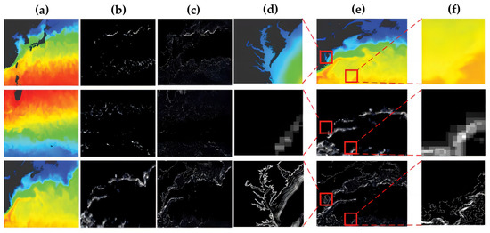 Comparison with the traditional method for ocean fronts detection [43]: (a) false color SST image; (b) multiscale deep framework (MDF); (c) traditional method; and (d)–(f) differences between MDF and the traditional method.