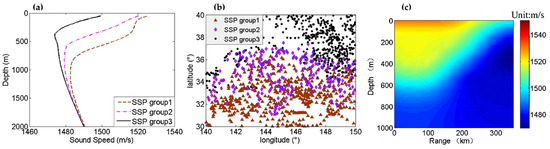 Results of cluster analysis and the KEF sound speed characteristic model [20]: (a) major feature of the three kinds of SSP; (b) spatial distributions of the three SSP groups; and (c) the KEF sound speed characteristic model.