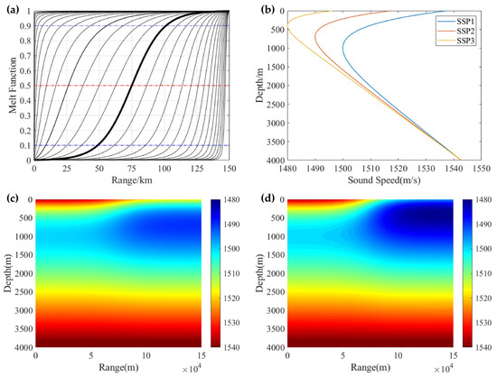 Ocean front model based on SSP [69]: (a) the variation of melt function with the range in ocean front model. The blue lines show the melt function at 0.1 and 0.9, respectively, while the red line represents the melt function at 0.5; (b) three typical sound speed profiles as input of ocean front model; and (c,d) the distribution of sound speed field of ocean front with different intensity output from the model.