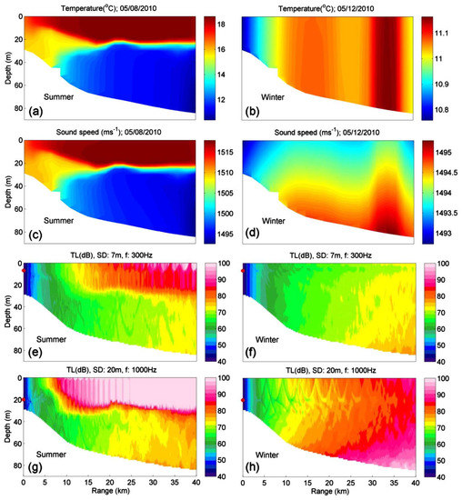 Seasonal variations of parameters when the sound source was on the onshore side of the ocean front in the Celtic Sea [73]: (a,b) temperature distribution; (c,d) sound speed distribution; (e,f) the TL at frequency 300 Hz with source depth 7 m; and (g,h) the TL at frequency 1000 Hz with source depth 20 m. The position of red dots represents the depth of the sound source.