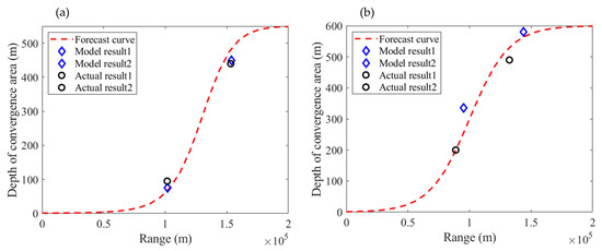 The forecasting curve of the depth of the convergence area (the red dotted line) and the calculating results of the model (blue dots) and actual ocean front (black dots): (a) 1 January, representing winter; (b) 1 July, representing summer. The forecasting results using the melt function were in good agreement with the model and the actual results, which proved that the melt function was applied to effectively achieve the depth forecast of the convergence area in the ocean front environment.