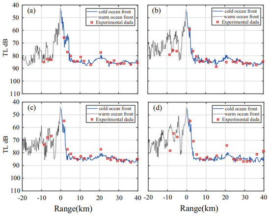 In recent years, with the enhancement of ocean observation capability and the rapid development of various underwater acoustic instruments, research on the acoustic effects of ocean fronts has been greatly promoted, especially the valuable data obtained from acoustic experiments. This will help us better understand the characteristics and laws of sound propagation in various specific ocean environments. Lynch et al. [74] used the high-resolution data from the 1996–1997 New England shelf break experiment to examine the spatial and temporal variability of the acoustic field in the region of a strong coastal shelf break front. Several interesting propagation effects were noted; the most interesting was the inhibition of strong acoustic-bottom interaction by the warm shelf water beneath the shelf break front, and the existence of small-scale ducts near the front, due to offshore transport. Ramp et al. [75] used the data of the Asian Seas International Acoustics Experiment (ASIAEX) in 2001 and found that, as a result of the Kuroshio front, the sound rays refracted downward. After passing through the shelf break front, the sound signal attenuated rapidly. They considered the influence of the uncertainty of the marine environment on the sonar operating distance from the perspective of sound ray propagation. Using a 93 Hz signal, the Lloyd mirror effect was found by Moore et al. [76] when the sound source depth was 50 m, and the sound ray was at a small grazing angle. This is because the presence of the front makes the incident sound wave generate total internal reflection. The direct and reflected modal rays can constructively interfere, having the potential to increase the intensity level by 6 dB. Deferrari [77] examined sound propagation for both environments with data from two similar fixed system propagation experiments: one for the prograde front environment of the coast of south Florida near the site of the Acoustic Observatory; and the second for the retrograde front environment of the Mid-Atlantic Bight. He observed intensity fluctuations and temporal coherencies of broadband acoustic signals over several octaves to vary with variations of the sound speed. Liu et al. [11] introduced a joint experiment of ocean acoustic and physical oceanography at the Western North Pacific fronts. The measurement data for sound waves passed through the ocean front was processed. It was found that the TL presented some difference when the source was in the front center and sound waves propagated towards water mass on opposite sides of the front center (Figure 8). Moore et al. [78] presented acoustic data collected on two Webb Slocum gliders during the Shallow Water Experiment (SW06) on the continental shelf off New Jersey. A major goal of these measurements was to quantify the three-dimensional propagation effects of the ocean front. Jensen et al. [79] calculated propagation through a real front observed on the Iceland-Faroe Ridge through the oceanographic data (conductivity, temperature, depth (CTD) sensors, expendable bathythermograph (XBT), thermistor chain) in the frontal area. They found that the acoustic effects of the front were significant (>10 dB), but with a strong dependence on environmental parameters as well as on source/receiver depth and frequency. Kravchun [80] described the hydrographic characteristics of the benthic front with the use of data from the international WOCE experiment. Meanwhile, he estimated the changes introduced by the benthic front into the phase and group velocities and the vertical structure of modes. In the summer of 1996, an integrated acoustic-oceanographic experiment was carried out in the Middle Atlantic Bight to study the dynamics of the shelf break front and the effects of frontal variability on sound propagation. Chiu et al. [81] reported the results of an acoustic tomographic analysis of frontal variability.