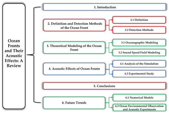 In this paper, we review the research progress of ocean fronts and their acoustic effects. The whole research process is summarized, and the technical route is given in Figure 9. Different from previous studies, we pay more attention to the acoustic perspective. The definition of ocean fronts, detection methods, modeling research, and the theoretical and experimental research of acoustic effects are reported in turn, which is easier for readers to understand.