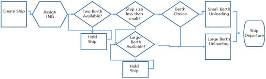 When a ship of 75,000 DWT or more enters the port, the ship immediately checks whether the 125,000-tons class dolphin is empty. If the 127,000 DWT dolphin is empty, it docks, otherwise it waits. In this case, there is only one soluble dolphin in a large ship. A procedures of simulation model for LNG dolphin is shown in Figure 1.