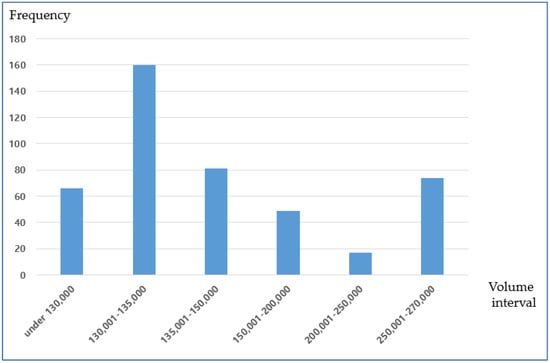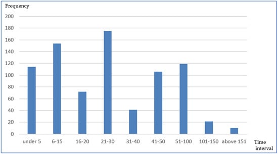 Ship arrival time interval means the time elapsed from the arrival of a ship until the arrival of the next ship. The analysis data is based on the Notice of Readiness (NOR) data, which is most closely related to the arrival time of the ship among the calling schedule data [,]. In the case of Incheon port base, the arrival time interval of the ships should be calculated by considering the total ships that entered the two terminals together.