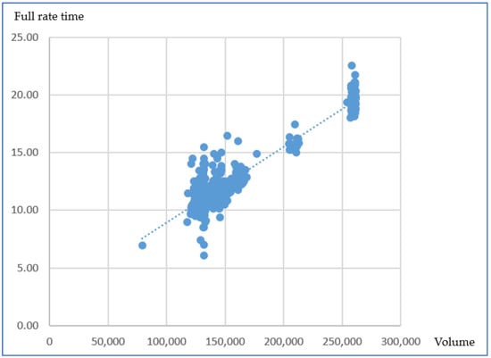 The full rate time during the unloading operation time is proportional to the loaded cargo volume as shown in Figure 4. As a result of analyzing 661 data for 3 years, the correlation coefficient between the cargo volume and the full rate time was found to be 72.7%.