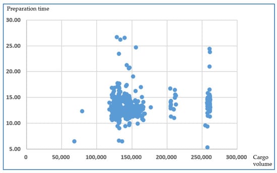 As a result of analyzing 661 data for 3 years, the correlation coefficient between the cargo volume and the preparation time for unloading and for ship departure was found to be −0.1% as shown in Figure 5.