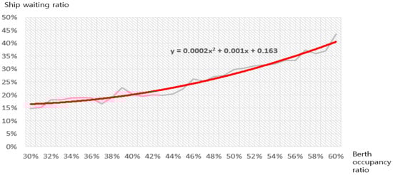Figure 6 shows the graph of the ship waiting rate and the dolphin occupancy. Here, the ship waiting rate is the waiting rate based on the simulation, so it is necessary to supplement it. Finding the trend line gives the following formula y = 0.0002x2 + 0.001x + 0.163. Based on this, the method of finding the new ship waiting rate is used.