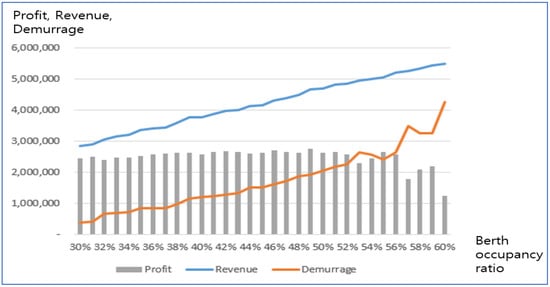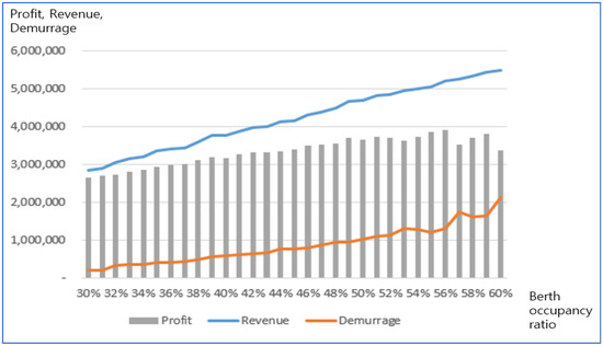 In this section, this study calculates the share with the maximum profit while changing the demurrage fee. Table 6 shows the relationship between dolphin occupancy and dolphin profit with demurrage of USD 40,000 per day using Equation (7). As dolphin occupancy increases, demurrage costs occur while the ship is waiting, and the shipper also pays demurrage costs to shipping company because the ship is tied to the berth. If the dolphin occupancy exceeds the proper level, it will cause a bottleneck of unloading, resulting in a sharp increase in demurrage.