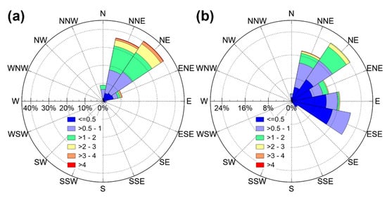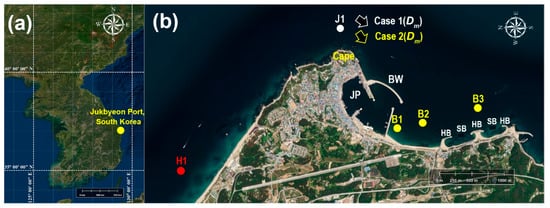 Jukbyeon Port (JP) is located in the middle of the east coast of the Korean Peninsula (Figure 1a). North of the port, a cape was developed from which a breakwater (BW) was constructed in the SE direction. Therefore, the BW could effectively block waves that propagated from the NE and E directions, the primary direction of the propagating waves in this region. In Figure 2, two wave roses are plotted showing the wave conditions in winter and summer in this area. The winter wave rose was based on the measurements from December 2019 to February 2020 in H1, and the summer rose was based on the measurements from June to August 2020. In winter, the wave propagation direction () ranged from NNE to NE, with the majority of the waves approaching in the NE direction, which confirmed the effectiveness of the BW when the waves approached in the represented direction. In summer, the primary wave direction was still NE. However, the waves approached from more diverse directions, as ~30% of the waves were from E and ESE directions. The measured wave height was higher in winter. The significant wave height () which was greater than 1 m was observed to be ~43.7% in winter. In addition, ~13.5% of was greater than 2 m, as they could be categorized as storm waves in this area [25]. In contrast, more than 85.2% of was lower than 1 m in summer. As confirmed from the data in the wave roses, the wave condition is usually rougher in winter in this region, except for the extreme storm waves caused by typhoons that are usually affiliated with the Korean Peninsula in late summer or early autumn.