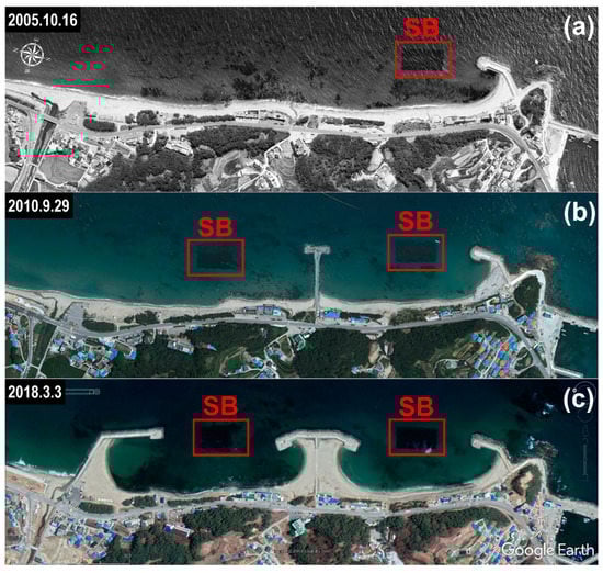 Although the BW effectively reduced the wave energy inside JP, side effects also occurred due to the shadow zone formed in the lee area of the BW. A shadow zone is an area behind an obstacle, into which the waves can be bent into due to wave diffraction. Because the wave energy gradually decreased in the shadow zone, as the diffracted wave was further propagated behind the obstacle (the BW in this case), the capacity of the sediment movement varied along the shore causing shoreline erosion near the outer edge of the shadow zone, whereas shoreline accretion occurred behind the obstacle [4]. Similar coastal erosion occurred in the beach located in the south of JP in which the coastal structures—a set of headland breakwaters (HBs)—were built to protect the beach from coastal erosion, as shown in Figure 1b. In addition, two submerged breakwaters (SBs) were placed in between the three HBs. The results of the construction of these structures were, however, not successful. In Figure 3, a collection of snapshot pictures shows the beach status throughout the history of these structures. In 2005, only one piece of the HB, a groin, and an SB were built at the southern end of the beach (Figure 3a). This set of structures was effective in conserving the beach sand, as the shoreline was considerably advanced at that time. However, further construction of the structures led to unfavorable results. As shown in Figure 3b,c, the shorelines in 2010 and 2018 had retreated compared to 2005, likely due to the additional structures. In particular, after the set of HB and SB was completed in 2018, the shorelines in between the HB were severely eroded, whereas the sand was moved and accumulated near the HBs that were built perpendicular to the shore. The severe erosions of this beach have brought concerns regarding the coastal protection of this area, which have motivated various experiments and observations in the study site near JP.