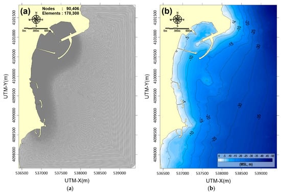 The unstructured grid system for TOMAWAC and ARTEMIS: (a) meshes around JP, with the smallest grid size of 5 m; (b) map of the water depths in the models based on bathymetry measurements.