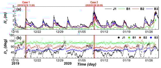 Time variations of the wave parameters during the field experiment: (a) significant wave height () and (b) peak wave direction ( ) calculated from the wave spectra measured at the four wave stations shown in Figure 1b. Black: J1; green: B1; red: B2; blue: B3.