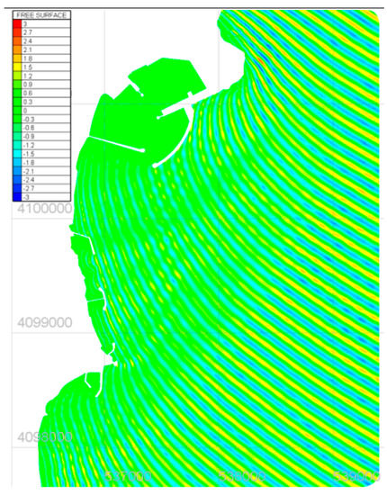 In this section, the results from the two numerical models were compared based on the observational data for the two cases listed in Table 1. From the field experiment, the wave parameters, and , were measured at each wave station (i.e., B1, B2, and B3) for Case 1 and Case 2 statistically using the spectra. TOMAWAC directly calculated these two parameters from the modeled spectra. In the case of ARTEMIS, the modeled data were analyzed to estimate these wave parameters. In order to estimate the wave propagating directions from ARTEMIS, it was necessary to run the phase-resolving model in the regular wave mode, forcing the model with a single wave height and period. Figure 6 shows an example of a wave propagation pattern that resulted from ARTEMIS using the regular wave mode in Case 2. It shows the distribution of the sea surface elevation at a given time step, indicating that the lines of the wave crests were clearly developed along the propagation. The figure also shows that the waves were transformed by changing directions as they approached the port. The wave height and direction could be calculated at each wave station by measuring the crest height and its propagating direction. However, model results in the regular wave mode would be less accurate, because the forcing conditions with only one wave height, period, and direction might lead to errors when applied along the whole open boundaries. Alternatively, ARTEMIS in Case 2 used the irregular wave mode in which the wave spectra from the phase-averaged model were also used as the boundary condition for this phase-resolving model. In this mode, the model results would not show the pattern of the wave propagation like the regular wave mode. Instead, the wave heights could be calculated from the distribution of the sea surface elevation field of the irregular waves. The wave propagation direction could not be evaluated in the irregular wave fields. Therefore, model validation and comparison with other phase-averaged models were only available for the wave height and not for the wave direction.