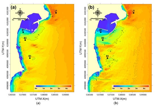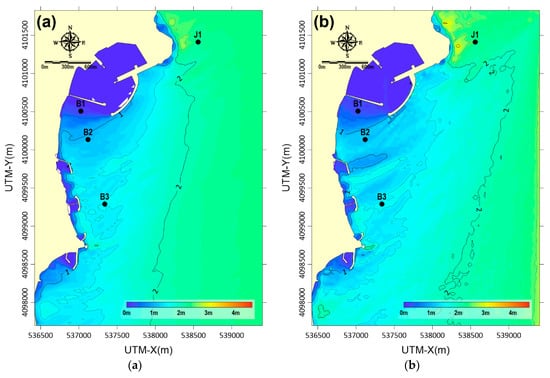 In Figure 5, the time variations of the wave data measured during the field experiment were compared among the wave stations. In this period, seven storm waves were affiliated with the study site by defining the event of storm waves when the maximum exceeded 2 m. The first event occurred on 18 December 2019, when the maximum reached 2.36 m at wave station J1. The biggest storm event occurred on 8 January 2020, when the maximum at J1 reached 3.81 m. As listed in Table 1, these two events were selected and set-up for the model runs as Case 1 and Case 2, respectively. Figure 5a shows that the wave height significantly decreased as the waves propagated from J1 to B1. In Case 1, for example, was 2.36 m at J1, which was reduced to 1.48 m at B3, 1.05 m at B2, and 0.3 m at B1. Therefore, at B1 was only ~12.7% of that measured at J1. In Case 2, was 3.81 m at J1, but reduced to 3.53, 2.74, and 1.12 at B3, B2, and B1, respectively, resulting in a 29.4% reduction in wave height at B1 compared to that at J1. The reason for the reduction in the wave height was due to the wave transformation, specifically by the diffraction, which was indicated by the pattern of the wave direction changes, as shown in Figure 5b. In the figure, significantly changes along the path of the wave propagation. For J1, shows severe fluctuations because the waves propagated in various directions, outside the port. As the waves approached closer to the port, however, the fluctuations became smoother and the averaged value of increased, indicating that the wave propagating direction changed toward the port’s entrance. For example, for B3, fluctuated around 60 (ENE) and around 90 (E) for B2. In the onshore station, B1, however, was stable around 120 (ESE). This rapid change in the wave direction in the lee area of the BW confirms the effect of the wave diffraction and also indicates that the significant reduction in along with the wave propagation (Figure 5a) could be closely related to the diffraction as well.