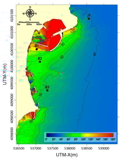 Considering the wave climate in the study area, where the wave conditions are more energetic in the winter, the field experiment in the present study was conducted for 46 days from 15 December 2019 to 29 January 2020, when the storm waves ( > 2 m) frequently attacked the study site. In this period, an AWAC (acoustic wave and current profiler, Nortek, Rud, Norway) was moored in J1, in front of the cape, as shown in Figure 1b, to observe the wave conditions outside the port. At the same time, vector velocimeters by Nortek were moored at the three wave stations of B1, B2, and B3 (Figure 1b). B1 was located just behind the BW outside JP at a depth of 5 m, which had its position within the shadow zone formed behind the BW. Therefore, the waves that reached B1 would be transformed by the diffraction. B2 was located near the border of the shadow zone at a depth of 10 m, considering that the majority of the waves approached in the NE direction in this area, specifically during the time of the field experiment, as shown in Figure 2a. In case of B3, the vector was located outside the shadow zone, ~870 m south of B2 along the coast at a depth of 10 m. The positions of B1, B2, B3, and J1 were determined to observe the wave transformation along the propagation paths toward the port, during the field experiment. It is to be noted that in the lee (shoreward) of B3, the HB and SB were located as shown in Figure 1b, which provided the complex feature of the shorelines, specifically in the lee area of B3.