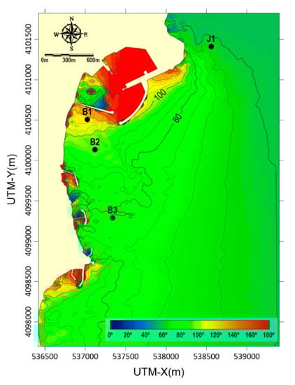 In Figure 8, the distribution of the wave propagation direction, , is contoured from the results of TOMAWAC, in Case 1. It is of note that the wave direction could not be estimated from the irregular mode of ARTEMIS, and its wave direction data are not included in the figure. It shows that the waves were gradually changing direction as they approached the shore. In particular, the directional change became more drastic near the shadow zone in the lee area of the BW, confirming the wave transformation by diffraction and/or refraction. It is of note, however, that the distribution became complicated near the coastal structures of the headland (HB) and submerged breakwaters (SBs). In Table 2, the calculated by the TOMAWAC are compared with observations as well. It shows that the modeled data agreed reasonably well with the observation, within an error range less than 10% (B1 = ~8%; B2 = ~7%; B3 = ~4%), confirming that the increased (i.e., the wave direction changed from NE to SE while approaching the port). It also shows that the errors increased as the waves approached closer to the port, which is discussed in Section 4.