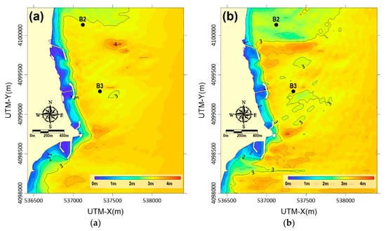 The reason for the low model accuracy of TELEMAC–ARTEMIS outside the shadow zone is not yet clearly understood. However, one possible scenario can be found from the interference of the waves that were reflected from the complicated coasts around the HB and SB, in the lee area of location B3 (Figure 1b). In Figure 11, the wave height distributions in Figure 9 are compared between the two models at a magnified view that focuses on the area around the coastal structures in the lee area of B3, in Case 2. It clearly shows that the spatial variation of the distribution was smoother in the case of the TOMAWAC results. In contrast, the distribution by ARTEMIS was rough, as spots of lower and higher magnitudes developed in this area. The irregular pattern of the distribution by ARTEMIS was likely due to the fact of wave interference. In TOMAWAC, the effect of wave reflection was not considered, whereas the reflection effect was considered in ARTEMIS by setting the reflection coefficient along the coastline. Therefore, in the case where the coastline became complicated due to the construction of various coastal structures, such as the HB and SB in this study, it was difficult to precisely determine the reflection coefficients of the different structures and of the sandy shorelines. The purpose of the present study was to compare the model performance between the TOMAWAC and ARTEMIS, while the reflection coefficient was not set-up for the TOMAWAC boundaries. For fairness with respect to the model conditions, only the default values were given for the ARTEMIS boundaries, and they were not specified for different structures. Therefore, it is not meaningful to decide which model provided the better performance in this area. However, the results indicate that it is important to precisely determine the reflection coefficients along complicated coastlines, specifically near coastal structures that have different reflectance, and a model’s accuracy could decrease if this parameter is not carefully considered. In terms of the wave transformation by refraction/diffraction, it turned out that ARTEMIS showed better performance, as expected from phase-resolving models. For example, the results were more accurate by ARTEMIS at the innermost wave station, B1, in both Case 1 and 2. In TOMAWAC, the modeled wave heights were either underestimated (Case 1) or overestimated (Case 2), indicating that the phase-average model had no specific error pattern in calculating the wave transformation effect.